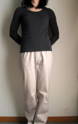 ただ、この生地だったら、もっと細くしても良かったかもしれません。ちょっともっさりしてますよね・・・元のパターンは少し裾広がりだったので、仮縫いの段階で、膝から裾にかけて垂直に落ちるようにしました。実際に縫ったパンツは、さらに裾幅を4cmカットしてますが、あまりすぼまっているように見えません。