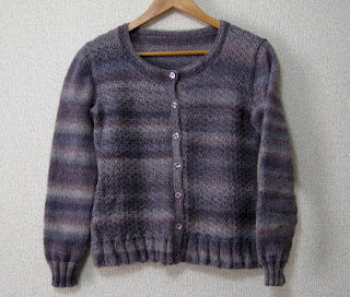 合わせるボタンによっては、かなり野暮ったくなってしまいそうなカーディガンでしたが、段染糸のランダムな色出しも、このボタンのおかげで一種のデザインに見えてきた・・・気もします。